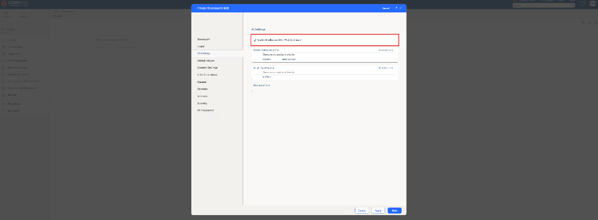 Navigate to the Teamroom where you want to enable the chat feature and select Settings from its context menu. Enable the Enable Mindbreeze AI for “Ask Questions” property on the AI Settings form page.