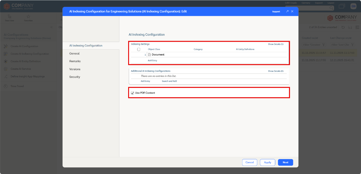 From the Fabasoft Approve dashboard, switch to the configuration by clicking Switch to Configuration, navigate to AI Settings and select Create AI Indexing Configuration, add the object classes that should be added to the AI index in the Indexing Settings property and check the Use PDF Content box.