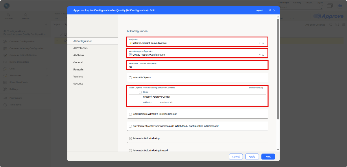 Next, select Create AI Configuration, create an AI configuration and edit the properties. Select the endpoint in the Endpoint property. If no endpoints appear in the drop down, select Find more entries to start a search for all available endpoints. Select the AI indexing configuration created in the previous step in the AI Indexing Configuration property, and enter a Maximum Content Size (MiB) (e. g. “90”). In the Index Objects From Following Solution Contexts field, add the Fabasoft Approve App you are configuring the AI integration for, e.g. “Fabasoft Approve Quality”. Then click Next to continue.