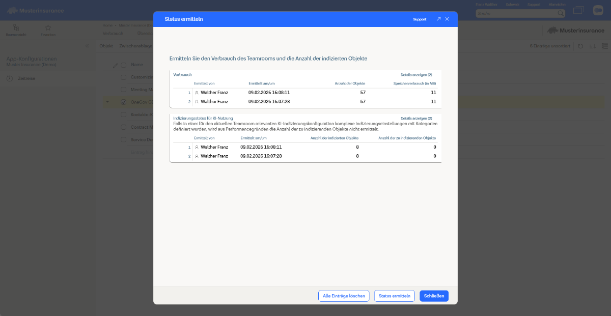 Als Eigentümer oder Organisations-Administrator können Sie den gesamten Speicherverbrauch einer App-Konfiguration (GEVER-Mandant) rekursiv berechnen lassen. Dies ermöglicht eine genaue Kontrolle über die belegten Ressourcen in Mandantensystemen.
