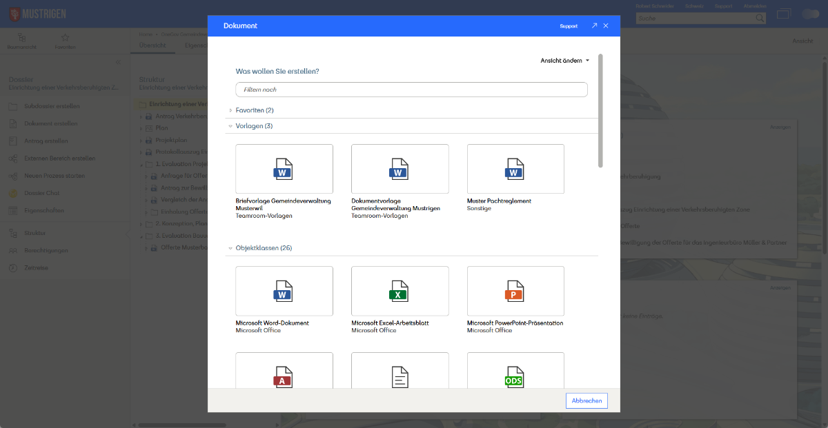 Über die Aktion „Dokument erstellen“ im Werkzeugbereich können Sie Dokumentvorlagen wählen und daraus ein neues Dokument erstellen. Die verfügbaren Vorlagen werden zuoberst dargestellt.