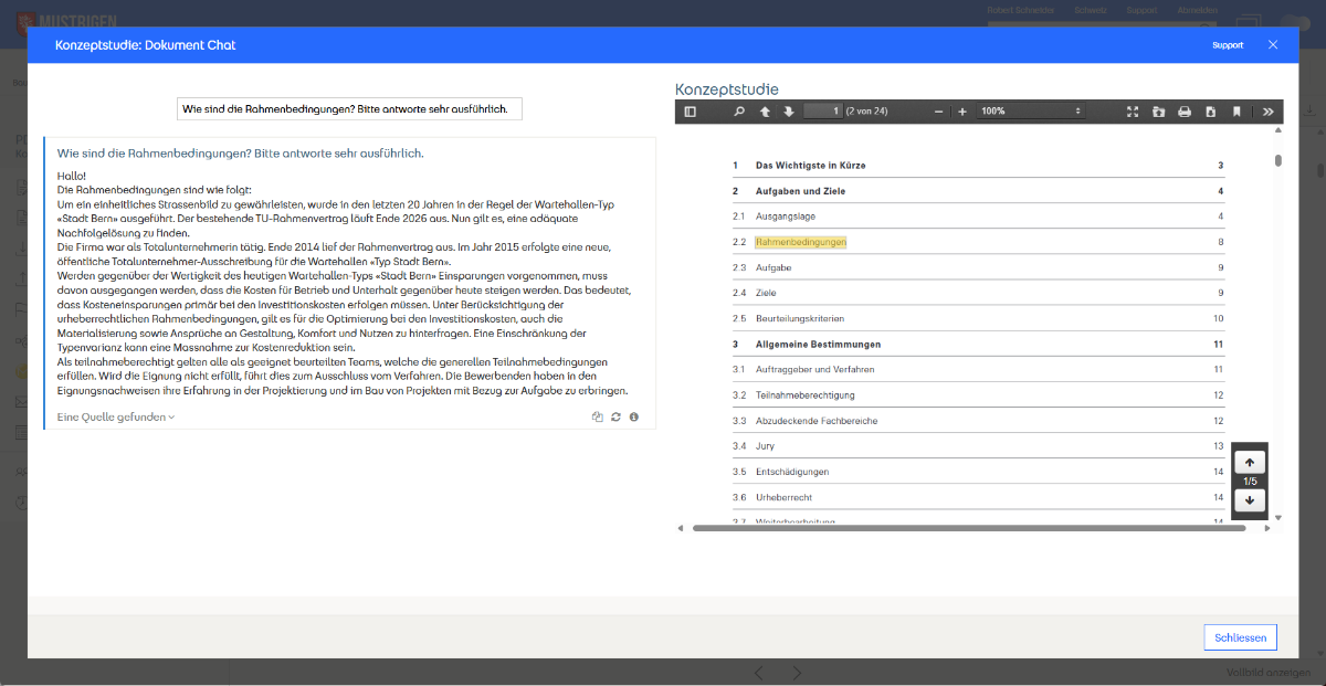 In der Vorschauansicht eines Dokuments haben Sie je nach Konfiguration die Möglichkeit, mit dem Dokumenten zu „chatten“. Um diese Funktion zu nutzen klicken Sie im Werkzeugbereich auf „Dokument Chat“. Im geöffneten Fenster können sie über den Suchschlitz mit dem Dokument interagieren und Fragen stellen.