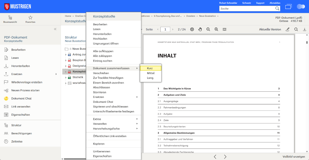 Über das Kontextmenü haben Sie die Möglichkeit, ein Dokument direkt in der Lösung zusammenzufassen, ohne das Dokument herunterzuladen und an einen externen Übersetzungsdienst zu senden. Sie können die Länge der Zusammenfassung wählen, die am besten zu Ihren Bedürfnissen passt: