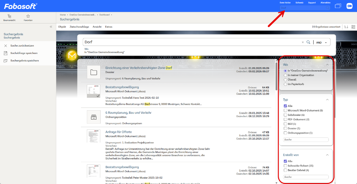 Fabasoft OneGov bietet eine leistungsstarke Suche an. Über das Suchfeld in der Kopfleiste (Alt + 4) können Sie eine Volltextsuche durchführen.