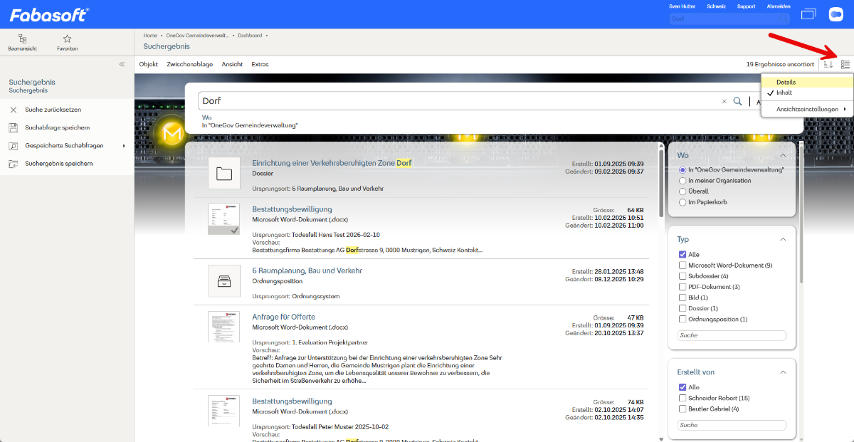 Standardmässig werden die Suchtreffer in einer Inhaltsauflistung dargestellt. Es besteht aber auch die Möglichkeit, sich die Treffer in tabellarischer Form anzeigen zu lassen. Nutzen Sie hierfür die Anzeigeeinstellung und wählen Sie „Details“. In der Detailansicht können Sie weitere Spalten mit den entsprechenden Metadaten anzeigen lassen.