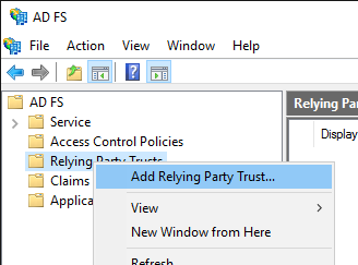- On the context menu of “Relying Party Trusts”, click “Add Relying Party Trust”.