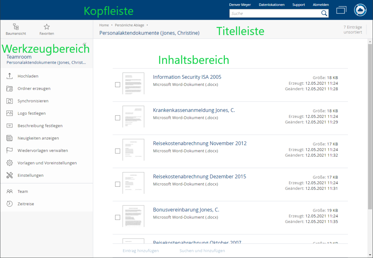 Im Inhaltsbereich wird der Inhalt des aktuellen Objekts angezeigt. Dies kann zum Beispiel der Inhalt einer Personalakte oder die Vorschau eines Dokuments sein. Die oberste Ebene wird als „Home“ bezeichnet.