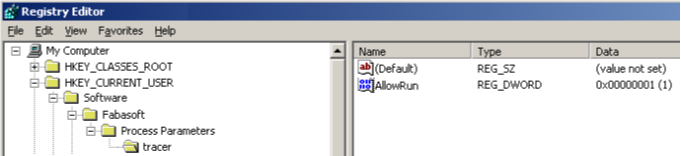 To explicitly allow the execution of a tool, there must be a registry key HKEY_CURRENT_USER > Software > Fabasoft > Process Parameters > <base name of the tool executable> holding a named value of type DWORD with the name AllowRun and the value “1”.