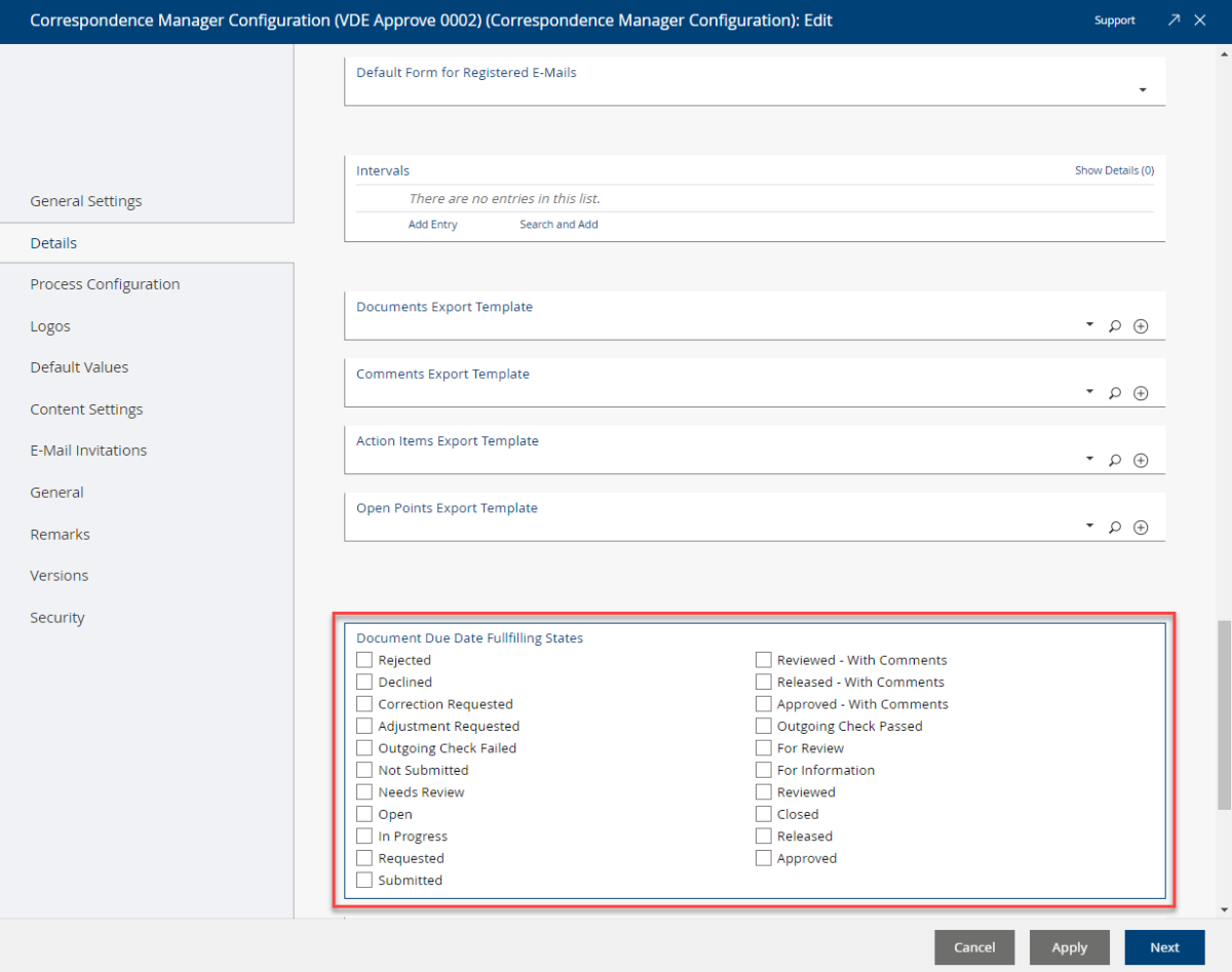 The administrator can set the criteria as to whether the due date of a document instance has been met under "Dashboard" > "Switch to configuration" > "Settings" > "Details" > Document Due Date Fulfilling States.