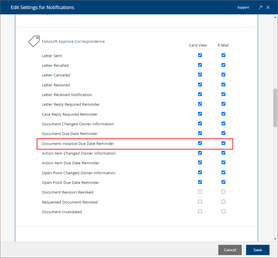 The setting as to whether or not reminder e-mails are sent can be made both centrally by the administrator and individually by the users themselves under the account menu (your user name) > "Advanced settings" > "Notifications" > "Settings" > "Fabasoft Approve Correspondence" > Document Instance Due Date Reminder.