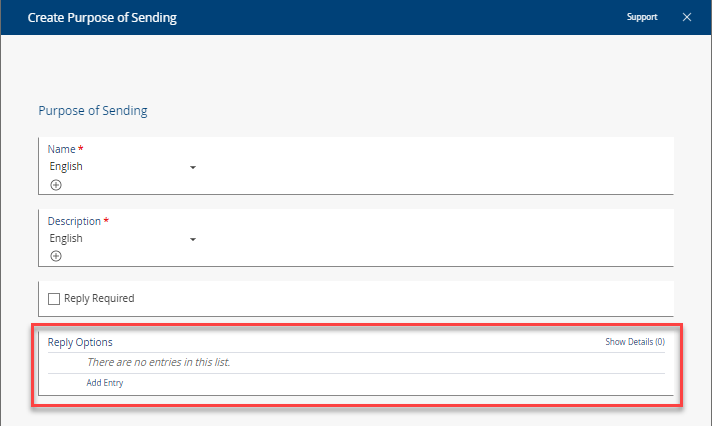 If a document is sent within a letter to a customer, partner or, for example, a certification body, the "Create Purpose of Sending" window can be used to specify which "Reply Options" are to be transferred. If the recipient of the letter makes changes to the document copy and then sends it back, he or she can choose from the predefined response options (such as "Approved", "Approved - With Comments" or "Declined").