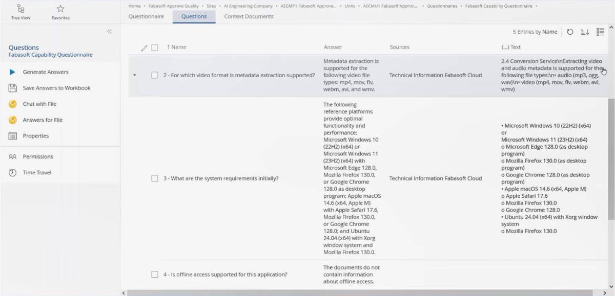 In Fabasoft Approve, AI-supported responses to questionnaires, checklists, and forms have been further improved. A new feature is that AI-generated responses reference the underlying document as the source and name the section of the document from which the information originates. This allows users to trace the origin of a response and check it specifically.