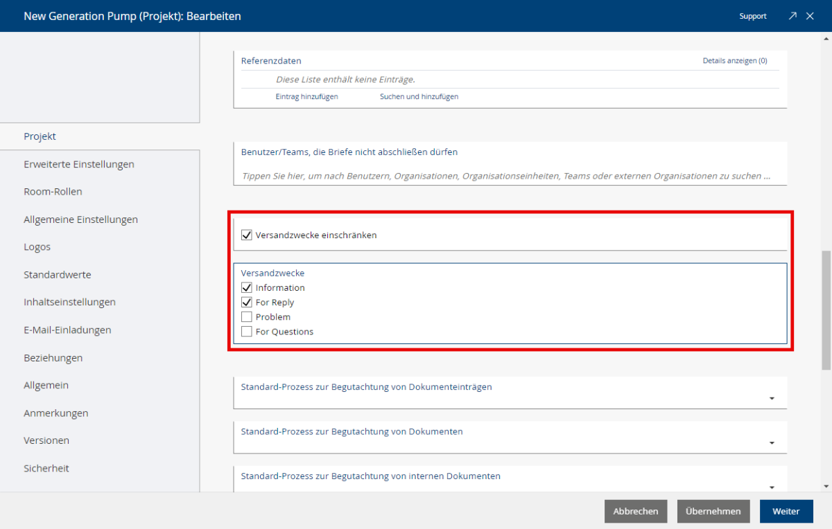 Wird die Option „Versandzwecke einschränken“ ausgewählt, werden alle Versandzwecke automatisch abgewählt und es kann manuell bestimmt werden, welche Versandzwecke für dieses Projekt verfügbar sein sollen. In folgendem Beispiel sind für das Projekt beispielsweise nur die Versandzwecke „Information“ und „For Reply“ erlaubt.