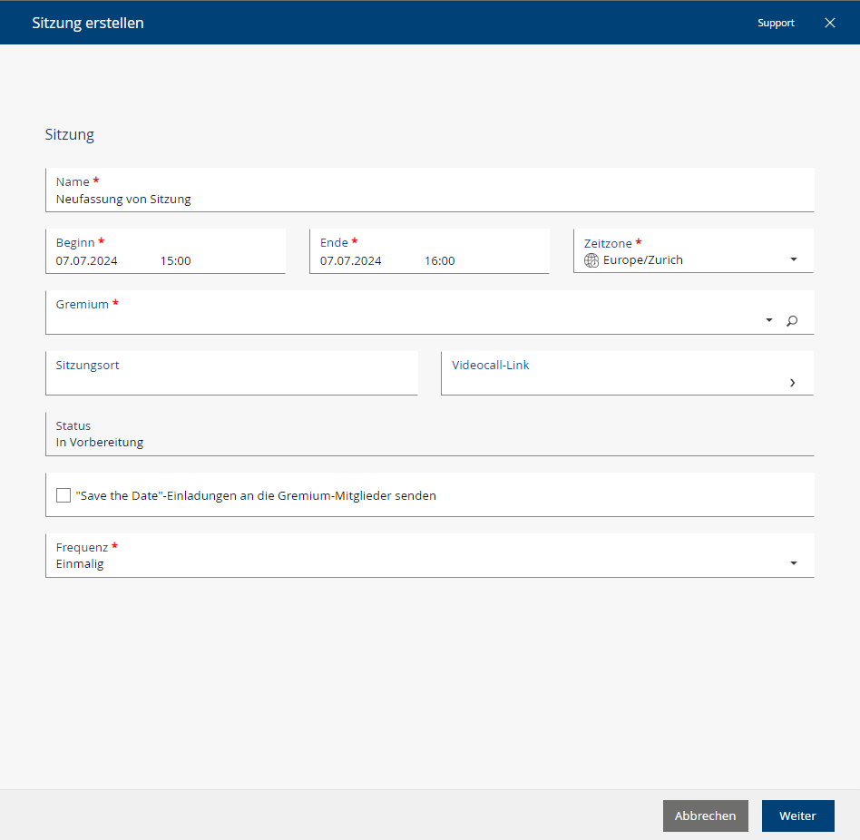 Wenn Sie eine neue Sitzung planen, haben Sie nun die Möglichkeit die Zeitzone auszuwählen. Werden die Teilnehmer:innen zur Sitzung eingeladen, erhalten Sie so automatisch den Termin zur korrekten Uhrzeit.