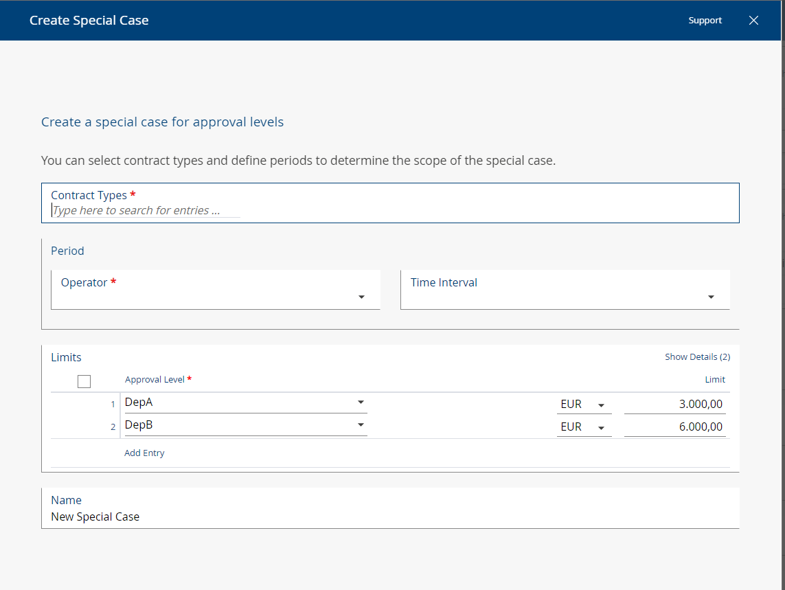 It is now possible to define not only standard limits for approval levels but also special cases. To this end, a new field has been added in the “Administration” tab of the Contract Manager configuration settings, named Special Cases for Approval Levels. At the same time, the existing field where you can define limits has been renamed to Default Limits for Approval Levels. The new dialog for the definition of a special case is depicted in the following screenshot.